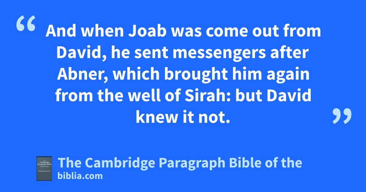 22 And behold, the servants of David and Joab came from pursuing a troop, and brought in a great spoil with them: but Abner was not with David in Hebron; for he had sent him away, and he was gone in peace. 23 When Joab and all the host that was with him were come, they told Joab, saying, Abner the son of Ner came to the king, and he hath sent him away, and he is gone in peace. 24 Then Joab came to the king, and said, What hast thou done? behold, Abner came unto thee; why is it that thou hast sent him away, and he is quite gone? 25 Thou knowest Abner the son of Ner, that he came to deceive thee, and to know uthy going out and thy coming in, and to know all that thou doest. 26 And when Joab was come out from David, he sent messengers after Abner, which brought him again from the well of Sirah: but David knew it not. 27 And when Abner was returned to Hebron, Joab xtook him aside in the gate to speak with him * quietly, and smote him there yunder the fifth rib, that he died, for the blood of Asahel his brother.
