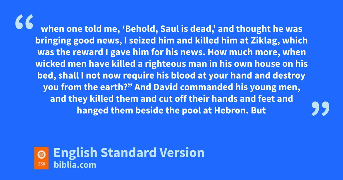 5 Now the sons of Rimmon the Beerothite, Rechab and Baanah, set out, and about the heat of the day they came to the house of Ish-bosheth as he was taking his noonday rest. 6 And they came into the midst of the house as if to get wheat, and they stabbed him lin the stomach. Then Rechab and Baanah his brother escaped.1 7 When they came into the house, as he lay on his bed in his bedroom, they struck him and put him to death and beheaded him. They took his head and went by the way of mthe Arabah all night, 8 and brought the head of Ish-bosheth to David at Hebron. And they said to the king, “Here is the head of Ish-bosheth, the son of Saul, your enemy, nwho sought your life. The Lord has avenged my lord the king this day on Saul and on his offspring.” 9 But David answered Rechab and Baanah his brother, the sons of Rimmon the Beerothite, o“As the Lord lives, pwho has redeemed my life out of every adversity, 10 qwhen one told me, ‘Behold, Saul is dead,’ and thought he was bringing good news, rI seized him and killed him at Ziklag, which was the reward I gave him for his news. 11 How much more, when wicked men have killed a righteous man in his own house on his bed, shall I not now srequire his blood at your hand and destroy you from the earth?” 12 And David commanded his young men, and they killed them and cut off their hands and feet and hanged them beside the pool at Hebron. But they took the head of Ish-bosheth and buried it tin the tomb of Abner at Hebron.