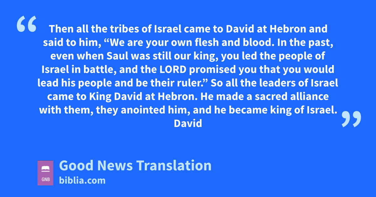 5 * Then all the tribes of Israel came to David at Hebron and said to him, “We are your own flesh and blood. 2*In the past, even when Saul was still our king, you led the people of Israel in battle, and the Lord promised you that you would lead his people and be their ruler.” 3*So all the leaders of Israel came to King David at Hebron. He made a sacred alliance with them, they anointed him, and he became king of Israel. 4*David was 30 years old when he became king, and he ruled for 40 years. 5*He ruled in Hebron over Judah for seven and a half years, and in Jerusalem over all Israel and Judah for 33 years.