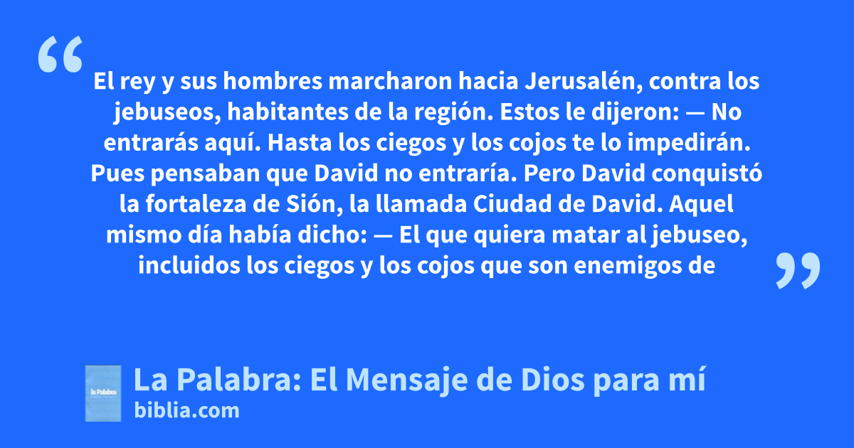 — El que quiera matar al jebuseo, incluidos los ciegos y los cojos que son enemigos de David, que se acerque por el canal.