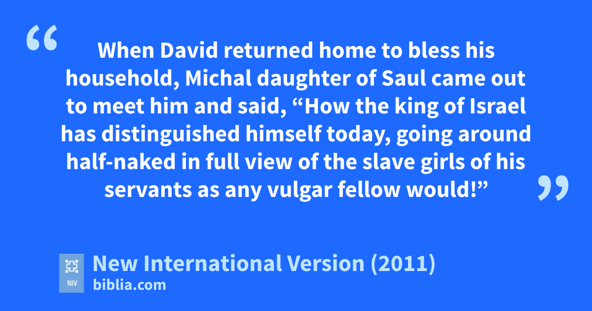 20 When David returned home to bless his household, Michal daughter of Saul came out to meet him and said, “How the king of Israel has distinguished himself today, going around half-nakede in full view of the slave girls of his servants as any vulgar fellow would!”