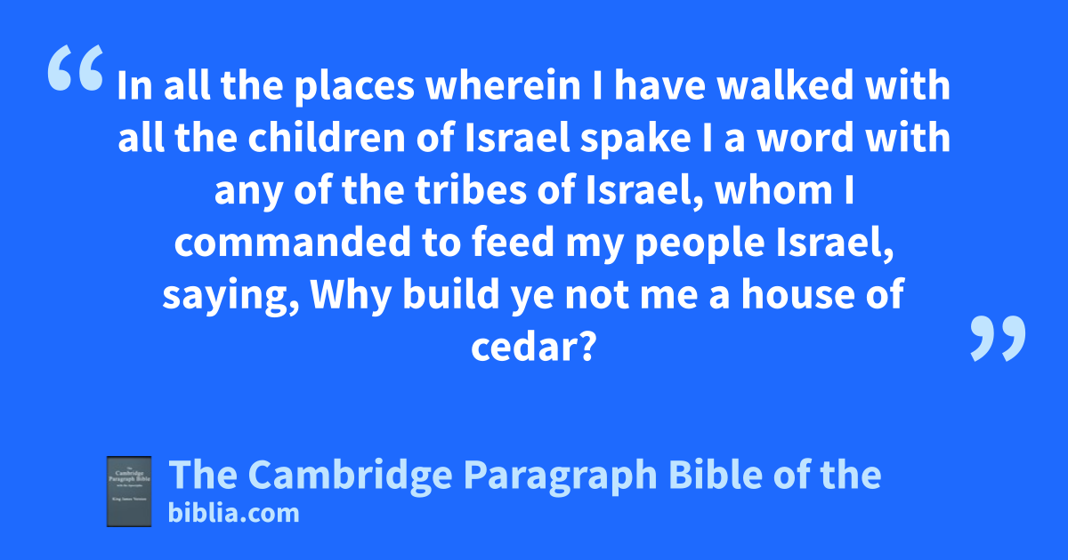 VII. And it came to pass, awhen the king sat in his house, and the Lord had given him rest round about from all his enemies; 2 that the king said unto bNathan the prophet, See now, I dwell in ca house of cedar, but the ark of God dwelleth within dcurtains. 3 And Nathan said to the king, Go, do all that is ein thine heart; for the Lord is with thee. 4 And it came to pass that night, that the word of the Lord came unto Nathan, saying, 5 Go and tell * my servant David, Thus saith the Lord, fShalt thou build me a house for me to dwell in? 6 Whereas I have not dwelt in any house gsince the time that I brought up the children of Israel out of Egypt, even to this day, but have walked in ha tent and in a tabernacle. 7 In all the places wherein I have iwalked with all the children of Israel spake I a word with * any of the tribes of Israel, whom I commanded kto feed my people Israel, saying, Why build ye not me a house of cedar? 8 Now therefore so shalt thou say unto my servant David, Thus saith the Lord of hosts, lI took thee from mthe sheepcote, * from following the sheep, to be ruler over my people, over Israel: 9 and nI was with thee whithersoever thou wentest, and have cut off all thine enemies * out of thy sight, and have made thee oa great name, like unto the name of the great men that are in the earth. 10 Moreover I will appoint a place for my people Israel, and will pplant them, that they may dwell in a place of their own, and qmove no more; neither shall the children of wickedness afflict them any more, as beforetime, 11 and as rsince the time that I commanded judges to be over my people Israel, and have scaused thee to rest from all thine enemies. Also the Lord telleth thee tthat he will make thee a house. 12 And uwhen thy days be fulfilled, and thou xshalt sleep with thy fathers, yI will set up thy seed after thee, which shall proceed out of thy bowels, and I will establish his kingdom. 13 zHe shall build a house for my name, and I will astablish the throne of his kingdom for ever. 14 bI will be his father, and he shall be my son. If he ccommit iniquity, I will chasten him with the rod of men, and with the stripes of the children of men: 15 but my mercy shall not depart away from him, das I took it from Saul, whom I put away before thee. 16 And thine house and thy kingdom shall be stablished for ever before thee: ethy throne shall be stablished for ever. 17 According to all these words, and according to all this fvision, so did Nathan speak unto David.