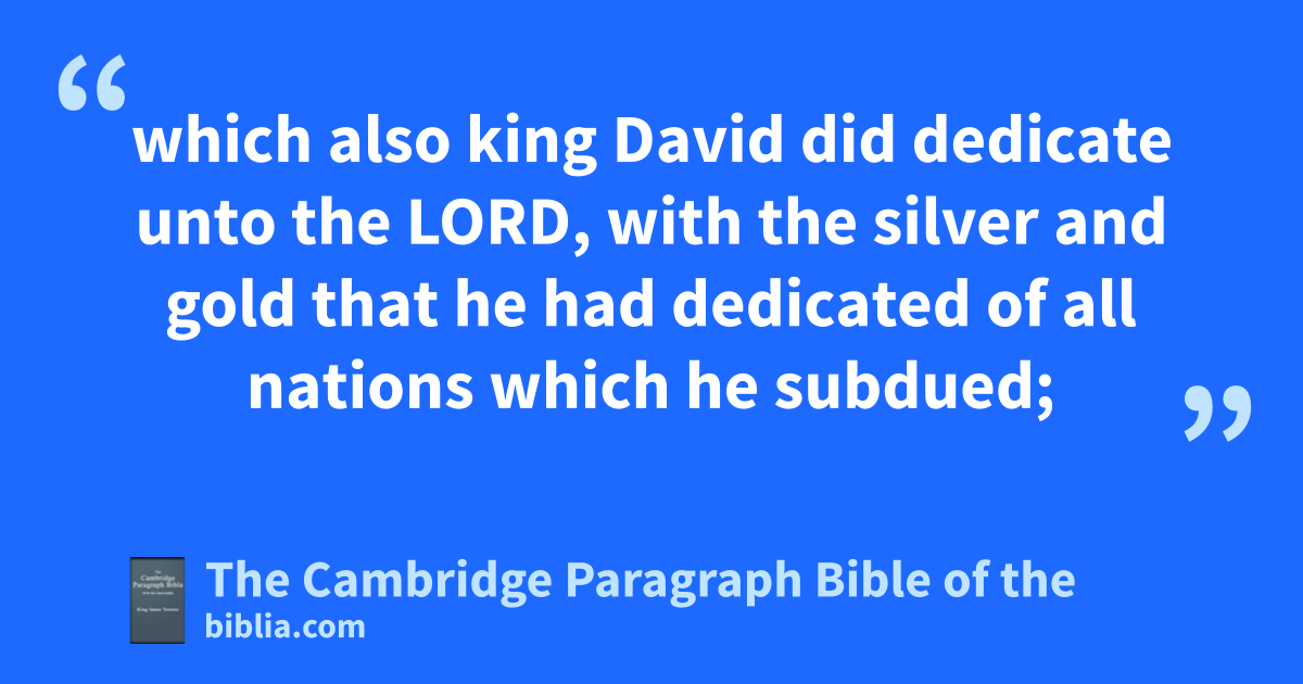 VIII. And aafter this it came to pass, that David smote the Philistines, and subdued them: and David took * Metheg-ammah out of the hand of the Philistines. 2 And bhe smote Moab, and measured them with a line, casting them down to the ground; even with two lines measured he to put to death, and with one full line to keep alive. And so the Moabites cbecame David’s servants, and dbrought gifts. 3 David smote also * Hadadezer, the son of Rehob, king of eZobah, as he went fto recover his border at the river Euphrates. 4 And David took * from him a thousand * chariots, and seven hundred horsemen, and twenty thousand footmen: and David ghoughed all the chariot horses, but reserved of them for an hundred chariots. 5 hAnd when the Syrians of Damascus came to succour Hadadezer king of Zobah, David slew of the Syrians two and twenty thousand men. 6 Then David put igarrisons in Syria of jDamascus: and the Syrians became servants to David, and brought gifts. kAnd the Lord preserved David whithersoever he went. 7 And David took lthe shields of gold that were on the servants of Hadadezer, and brought them to Jerusalem. 8 And from * Betah, and from * Berothai, cities of Hadadezer, king David took exceeding much brass. 9 When * Toi king mof Hamath heard that David had smitten all the host of Hadadezer, 10 then Toi sent * Joram his son unto king David, to * salute him, and to bless him, because he had fought against Hadadezer, and smitten him: for Hadadezer * had wars with Toi. And Joram * brought with him vessels of silver, and vessels of gold, and vessels of brass: 11 which also king David ndid dedicate unto the Lord, with the silver and gold that he had dedicated of all nations which he subdued; 12 of Syria, and of Moab, and oof the children of Ammon, and pof the Philistines, and qof Amalek, and of the spoil of Hadadezer, son of Rehob, king of Zobah. 13 And David gat him a name when he returned from * smiting of the Syrians in rthe valley of salt, s* being eighteen thousand men. 14 And he put igarrisons in Edom; throughout all Edom put he igarrisons, and tall they of Edom became David’s servants. uAnd the Lord preserved David whithersoever he went.