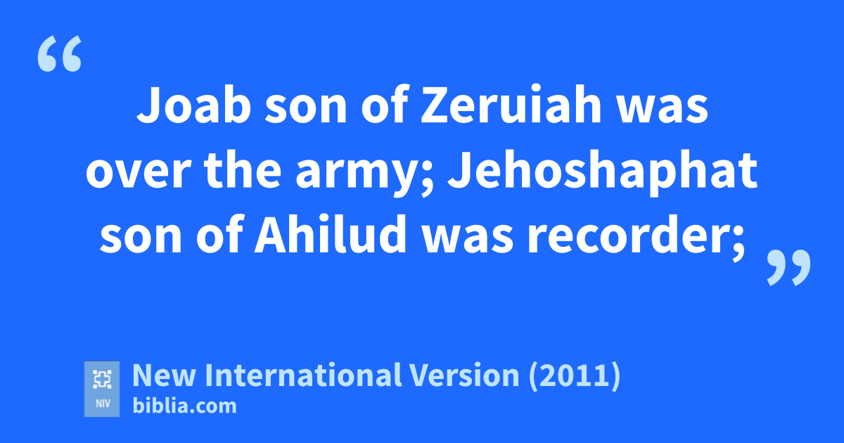 15 David reigned over all Israel, doing what was just and rightx for all his people. 16 Joaby son of Zeruiah was over the army; Jehoshaphatz son of Ahilud was recorder;a 17 Zadokb son of Ahitub and Ahimelek son of Abiatharc were priests; Seraiah was secretary;d 18 Benaiahe son of Jehoiada was over the Kerethitesf and Pelethites; and David’s sons were priests.h