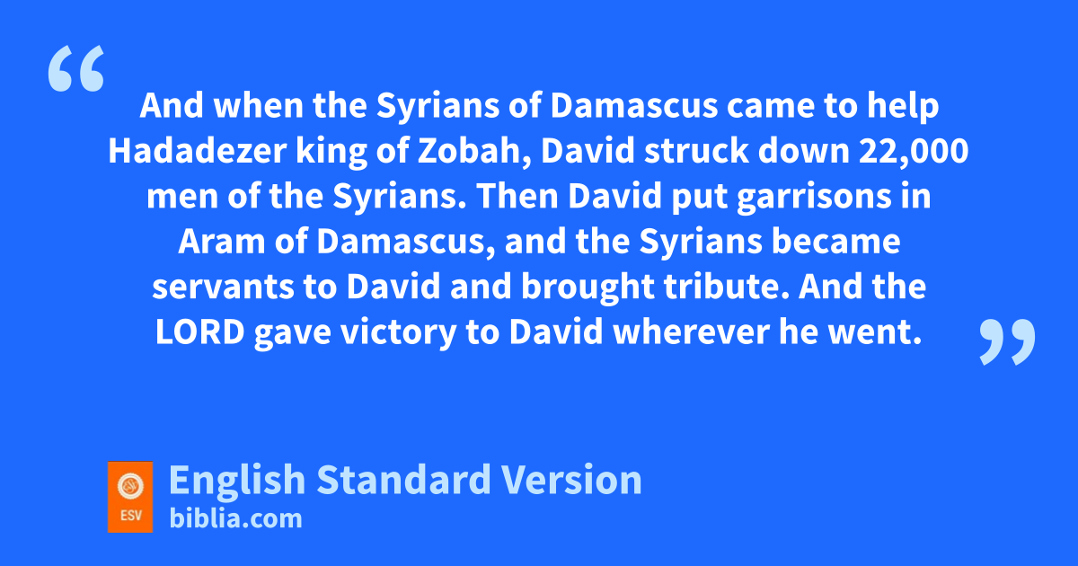 3 David also defeated lHadadezer the son of Rehob, king of mZobah, as he went to restore his power at the river Euphrates. 4 nAnd David took from him 1,700 horsemen, and 20,000 foot soldiers. And David ohamstrung all the chariot horses but left enough for 100 chariots. 5 pAnd when the qSyrians of Damascus came to help lHadadezer king of mZobah, David struck down 22,000 men of the Syrians. 6 Then David put garrisons in Aram of Damascus, and the Syrians rbecame servants to David and brought tribute. sAnd the Lord gave victory to David wherever he went. 7 And David took tthe shields of gold that were carried by the servants of Hadadezer and brought them to Jerusalem. 8 And from Betah and from Berothai, cities of Hadadezer, King David took very much bronze.