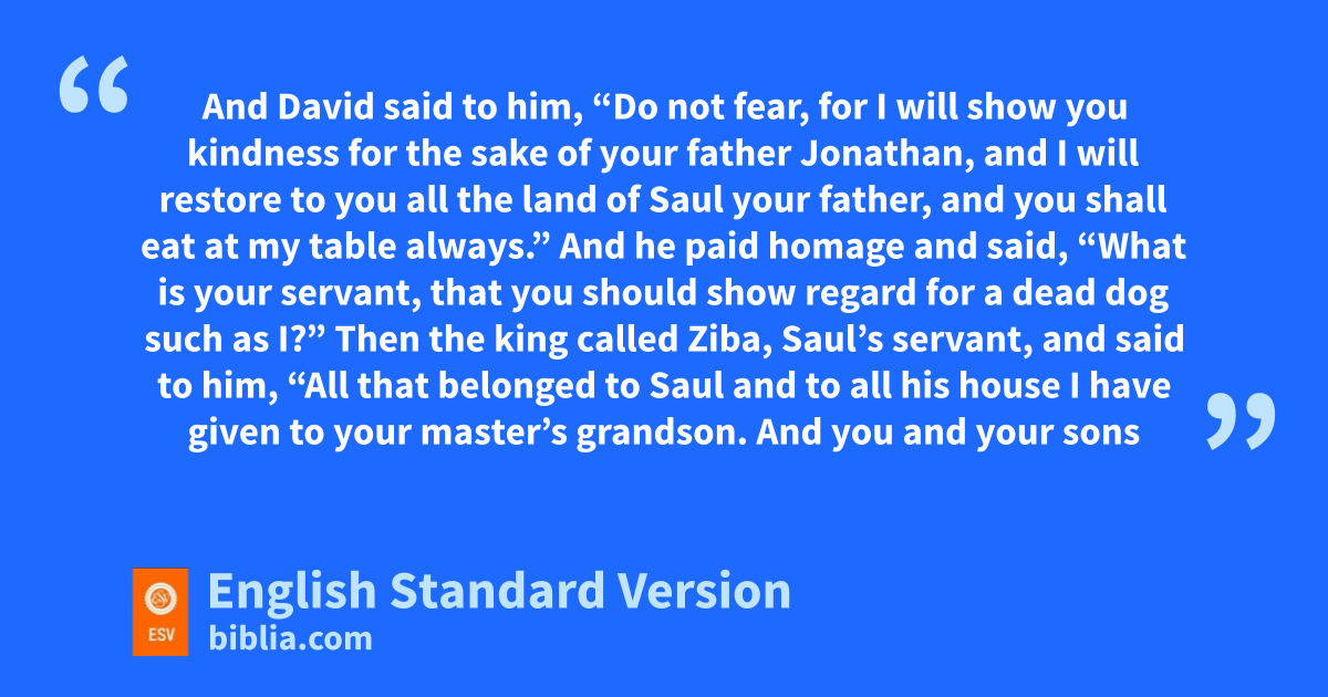 9 And David said, “Is there still anyone left of the house of Saul, that I may ishow him kindness for Jonathan’s sake?” 2 Now there was a servant of the house of Saul whose name was jZiba, and they called him to David. And the king said to him, “Are you Ziba?” And he said, “I am your servant.” 3 And the king said, “Is there not still someone of the house of Saul, that I may show kthe kindness of God to him?” Ziba said to the king, “There is still a son of lJonathan; he is crippled in his feet.” 4 The king said to him, “Where is he?” And Ziba said to the king, “He is in the house of mMachir the son of Ammiel, at Lo-debar.” 5 Then King David sent and brought him from the house of Machir the son of Ammiel, at Lo-debar. 6 And nMephibosheth the son of Jonathan, son of Saul, came to David and fell on his face and paid homage. And David said, “Mephibosheth!” And he answered, “Behold, I am your servant.” 7 And David said to him, “Do not fear, ifor I will show you kindness for the sake of your father Jonathan, and I will restore to you all the land of Saul your father, and oyou shall eat at my table always.” 8 And he paid homage and said, “What is your servant, that you should show regard for pa dead dog such as I?”