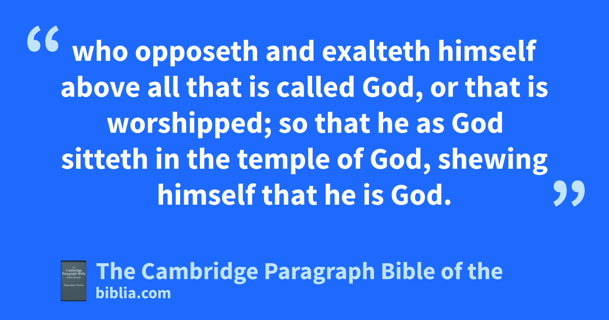 II. Now we beseech you, brethren, aby the coming of our Lord Jesus Christ, and by bour gathering together unto him, 2 that ye be not soon shaken in mind, or cbe troubled, neither dby spirit, nor eby word, nor eby letter as from us, as that fthe day of Christ is at hand. 3 gLet no man deceive you by any means: for that day shall not come, hexcept there come ia falling away first, and jthat man of sin be revealed, kthe son of perdition; 4 who opposeth and jexalteth himself above all lthat is called God, or mthat is worshipped; so that he as God sitteth in the temple of God, shewing himself that he is God. 5 nRemember ye not, that, when I was yet with you, I told you these things? 6 And now ye know what * owithholdeth that he might be revealed in his time. 7 For pthe mystery of qiniquity doth already work: only he who now oletteth will let, until he be taken out of the way. 8 And then shall that jqWicked be revealed, rwhom the Lord shall consume swith the spirit of his mouth, and shall destroy with tthe brightness of ahis coming: 9 even him, whose coming is uafter the working of wSatan xwith all power and ysigns and lying ywonders, 10 and with all deceivableness of zunrighteousness in athem that perish; because they received not bthe love of zthe truth, that they might be saved. 11 And for this cause cGod shall send them strong delusion, that they should believe da lie: 12 that they all might be damned who ebelieved not zthe truth, but fhad pleasure in zunrighteousness.