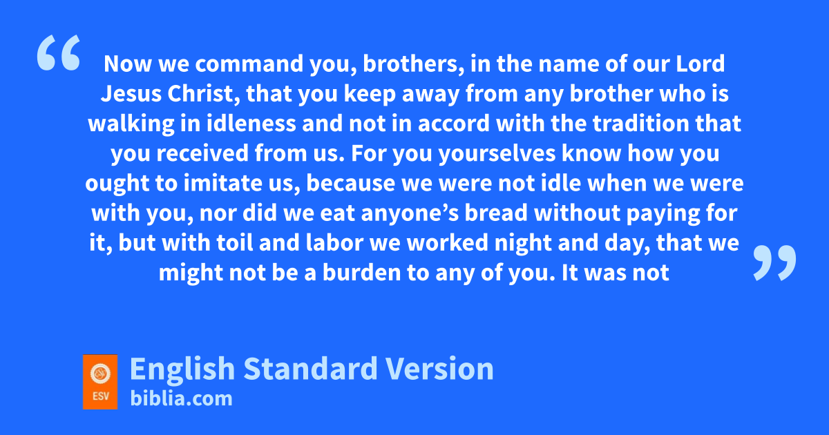 6 Now we command you, brothers, sin the name of our Lord Jesus Christ, tthat you keep away from any ubrother vwho is walking in idleness and not in accord with the tradition that you received from us. 7 For you yourselves know whow you ought to imitate us, because xwe were not idle when we were with you, 8 nor did we eat anyone’s bread without paying for it, but ywith toil and labor we worked night and day, that we might not be a burden to any of you. 9 It was znot because we do not have that right, but to give you in ourselves aan example to imitate. 10 For even when we were with you, we would give you this command: bIf anyone is not willing to work, let him not eat. 11 For we hear that some among you cwalk in idleness, not busy at work, but dbusybodies. 12 Now such persons we command and encourage in the Lord Jesus Christ to do their work quietly and to earn their own living.4
