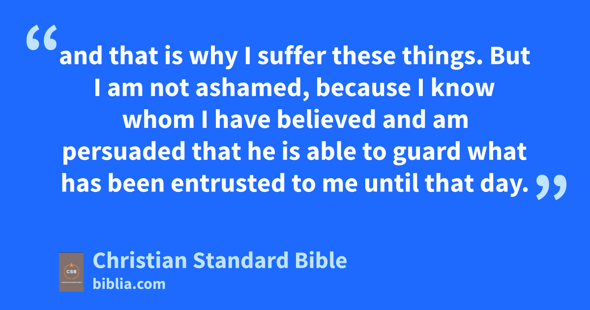 8 So don’t be ashamedm of the testimony about our Lord,n or of me his prisoner.o Instead, share in suffering for the gospel, relying on the powerp of God. 9 He has saved us and called us with a holy calling,q not according to our works,r but according to his own purposes and grace, which was given to us in Christ Jesus before time began. 10 This has now been made evident through the appearingt of our Savior Christ Jesus, who has abolished deathu and has brought lifev and immortality to light through the gospel. 11 For this gospel I was appointedw a herald, apostle, and teacher,B 12 and that is why I sufferx these things. But I am not ashamed, because I know whom I have believed and am persuaded that he is able to guard what has been entrusted to meC,y until that day.z
