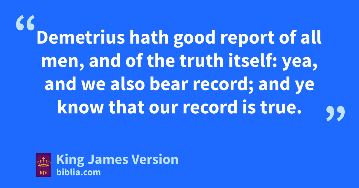 9 I wrote unto the church: but Diotrephes, who loveth to have the preeminence among them, receiveth us not. 10 Wherefore, if I come, I will remember his deeds which he doeth, nprating against us with malicious words: and not content therewith, neither doth he himself receive the brethren, and forbiddeth them that would, and casteth them out of the church. 11 Beloved, ofollow not that which is evil, but that which is good. pHe that doeth good is of God: but he that doeth evil qhath not seen God. 12 Demetrius rhath good report of all men, and of the truth itself: yea, and we also bear record; sand ye know that our record is true.