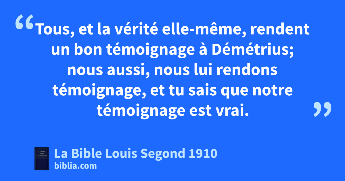 12Tous, et la vérité elle-même, rendent un bon témoignage à Démétrius; nous aussi, nous lui rendons témoignage, et tu sais que notre témoignage est vrai. 13cJ’aurais beaucoup de choses à t’écrire, mais je ne veux pas le faire avec l’encre et la plume. 14J’espère te voir bientôt, et nous parlerons de bouche à bouche. 15Que la paix soit avec toi! Les amis te saluent. Salue les amis, chacun en particulier.