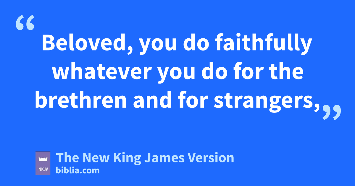 5 Beloved, you do faithfully whatever you do for the brethren 2and for strangers, 6 who have borne witness of your love before the church. If you send them forward on their journey in a manner worthy of God, you will do well, 7 because they went forth for His name’s sake, etaking nothing from the Gentiles. 8 We therefore ought to freceive 3such, that we may become fellow workers for the truth.