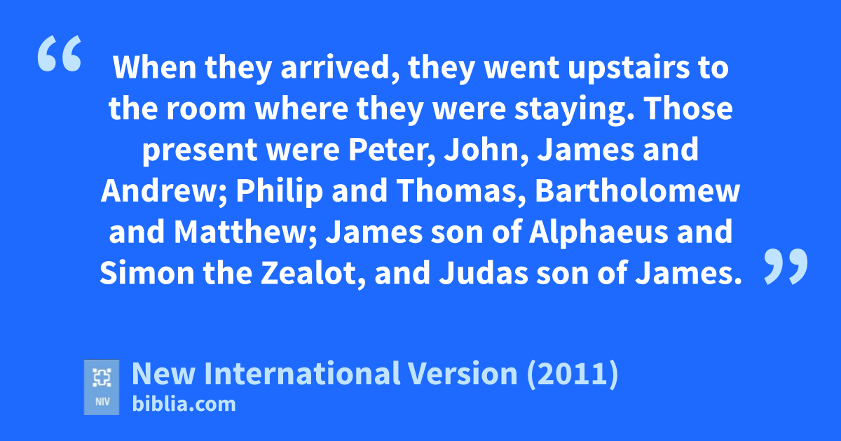 12 Then the apostles returned to Jerusalemw from the hill called the Mount of Olives,x a Sabbath day’s walkc from the city. 13 When they arrived, they went upstairs to the roomy where they were staying. Those present were Peter, John, James and Andrew; Philip and Thomas, Bartholomew and Matthew; James son of Alphaeus and Simon the Zealot, and Judas son of James.z 14 They all joined together constantly in prayer,a along with the womenb and Mary the mother of Jesus, and with his brothers.c