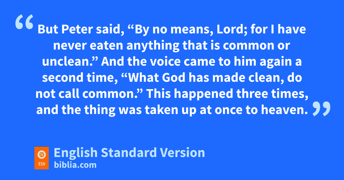 9 The next day, as they were on their journey and approaching the city, ePeter went up fon the housetop about gthe sixth hour2 to pray. 10 And he became hungry and wanted something to eat, but while they were preparing it, he fell into ha trance 11 and saw ithe heavens opened and something like a great sheet descending, being let down by its four corners upon the earth. 12 In it were all kinds of animals and reptiles and birds of the air. 13 And there came a voice to him: “Rise, Peter; kill and eat.” 14 But Peter said, “By no means, Lord; jfor I have never eaten anything that is kcommon or lunclean.” 15 And the voice came to him again a second time, m“What God has made clean, do not call common.” 16 This happened three times, and the thing was taken up at once to heaven.