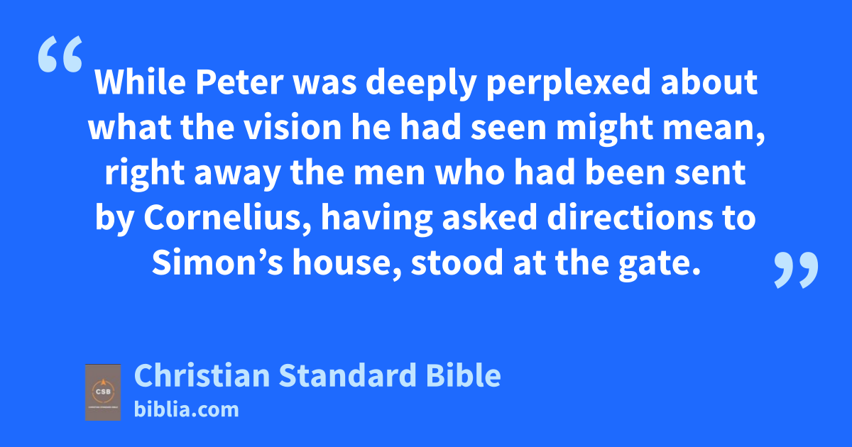 17 While Peter was deeply perplexed about what the vision he had seen might mean, right away the men who had been sent by Cornelius, having asked directions to Simon’s house, stood at the gate. 18 They called out, asking if Simon, who was also named Peter, was lodging there.
