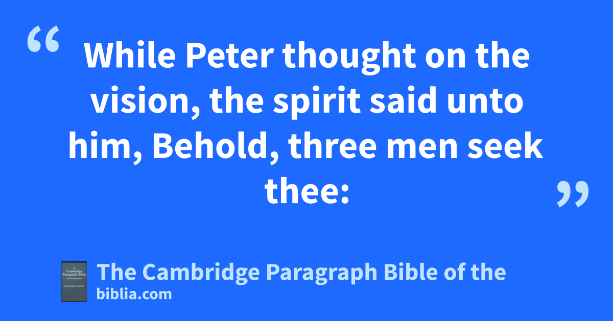 17 Now while Peter ydoubted in himself what this fvision which he had seen should mean, behold, the men which were sent from Cornelius had made inquiry for Simon’s house, and zstood before athe gate, 18 and called, and asked whether Simon, which was surnamed Peter, were lodged there. 19 While Peter thought on the vision, the spirit said unto him, Behold, bthree men seek thee: 20 arise therefore, and get thee down, and cgo with them, ddoubting nothing: for I have sent them. 21 Then Peter went down to the men which were sent unto him from Cornelius; and said, Behold, I am he whom ye seek: what is the cause wherefore ye are come? 22 And they said, Cornelius the centurion, a just man, and eone that feareth God, and fof good report among all the nation of the Jews, was gwarned from God by a hholy angel to send for thee into his house, and ito hear words of thee. 23 Then called he them in, and lodged them. And on the morrow Peter went away with them, and jcertain kbrethren from Joppa accompanied him. 24 And the morrow after they entered into lCesarea. And Cornelius waited for them, and had called together his kinsmen and near friends.