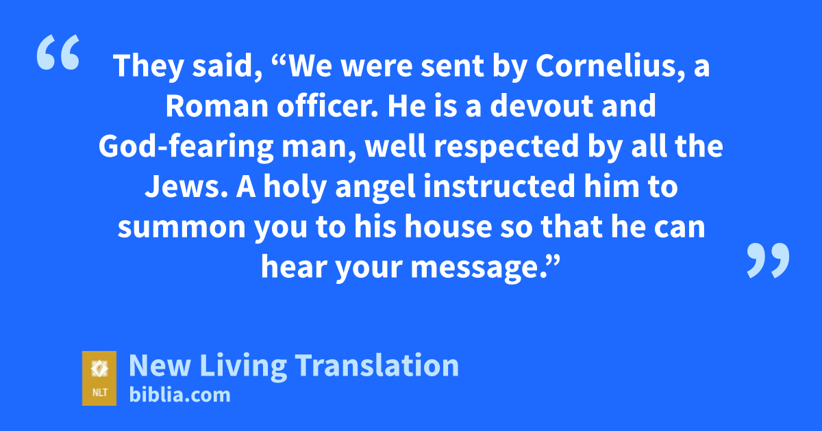22 They said, “We were sent by Cornelius, a Roman officer. He is a devout and God-fearing man, well respected by all the Jews. A holy angel instructed him to summon you to his house so that he can hear your message.” 23 So Peter invited the men to stay for the night. The next day he went with them, accompanied by some of the brothers from Joppa.