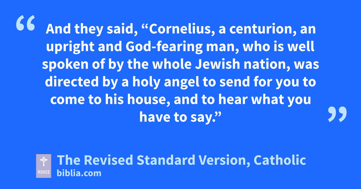 1 At Caesarea there was a man named Cornelius, a centurion of what was known as the Italian Cohort, 2 a devout man who feared God with all his household, gave alms liberally to the people, and prayed constantly to God. 3 About the ninth hour of the day he saw clearly in a vision an angel of God coming in and saying to him, “Cornelius.” 4 And he stared at him in terror, and said, “What is it, Lord?” And he said to him, “Your prayers and your alms have ascended as a memorial before God. 5 And now send men to Joppa, and bring one Simon who is called Peter; 6 he is lodging with Simon, a tanner, whose house is by the seaside.” 7 When the angel who spoke to him had departed, he called two of his servants and a devout soldier from among those that waited on him, 8 and having related everything to them, he sent them to Joppa.