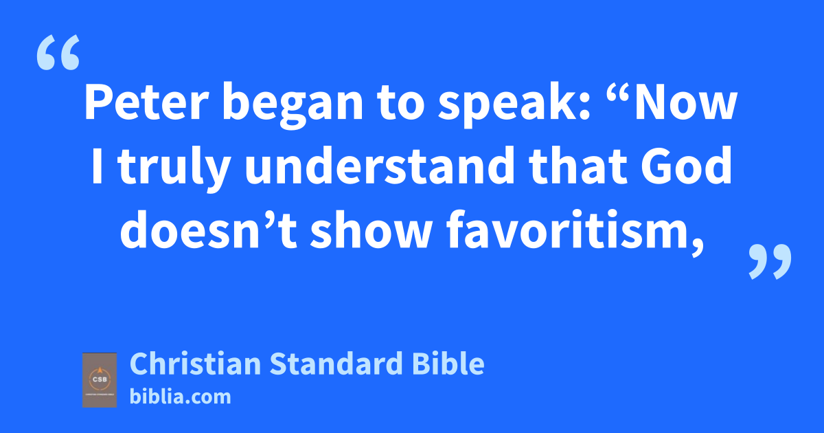 34 Peter began to speak: “Now I truly understand that God doesn’t show favoritism,i 35 but in every nation the person who fears him and does what is right is acceptable to him. 36 He sent the message to the Israelites, proclaiming the good news of peace through Jesus Christ—he is Lord of all.j 37 You know the events that took place throughout all Judea, beginning from Galilee after the baptism that John preached: 38 how God anointed Jesus of Nazareth with the Holy Spirit and with power, and how he went about doing good and healing all who were under the tyranny of the devil, because God was with him.k 39 We ourselves are witnesses of everything he did in both the Judean country and in Jerusalem, and yet they killed him by hanging him on a tree.l 40 God raised up this man on the third day and caused him to be seen, 41 not by all the people, but by us whom God appointed as witnesses, who ate and drank with him after he rose from the dead.m 42 He commanded us to preach to the people and to testify that he is the one appointed by God to be the judge of the living and the dead.n 43 All the prophets testifyo about him that through his namep everyone who believes in him receives forgiveness of sins.”q