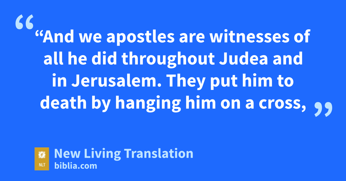 39 “And we apostles are witnesses of all he did throughout Judea and in Jerusalem. They put him to death by hanging him on a cross,* 40 but God raised him to life on the third day. Then God allowed him to appear, 41 not to the general public,* but to us whom God had chosen in advance to be his witnesses. We were those who ate and drank with him after he rose from the dead. 42 And he ordered us to preach everywhere and to testify that Jesus is the one appointed by God to be the judge of all—the living and the dead. 43 He is the one all the prophets testified about, saying that everyone who believes in him will have their sins forgiven through his name.”