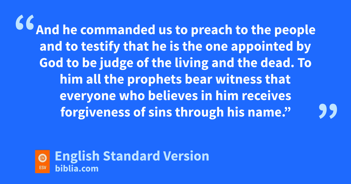34 So Peter opened his mouth and said: “Truly I understand that fGod gshows no partiality, 35 but fin every nation anyone who fears him and hdoes what is right is acceptable to him. 36 As for ithe word that he sent to Israel, jpreaching good news of kpeace through Jesus Christ (lhe is Lord of all), 37 you yourselves know what happened throughout all Judea, mbeginning nfrom Galilee after the baptism that John proclaimed: 38 how oGod anointed Jesus of Nazareth pwith the Holy Spirit and with qpower. He went about doing good and healing all rwho were oppressed by the devil, sfor God was with him. 39 And twe are witnesses of all that he did both in the country of the Jews and in Jerusalem. uThey put him to death by hanging him on a tree, 40 but vGod raised him on wthe third day and made him to xappear, 41 ynot to all the people but to us who had been chosen by God as zwitnesses, who ate and drank with him after he rose from the dead. 42 And ahe commanded us to preach to the people and to testify bthat he is the one appointed by God to be judge cof the living and the dead. 43 dTo him eall the prophets bear witness that feveryone who believes in him receives gforgiveness of sins hthrough his name.”