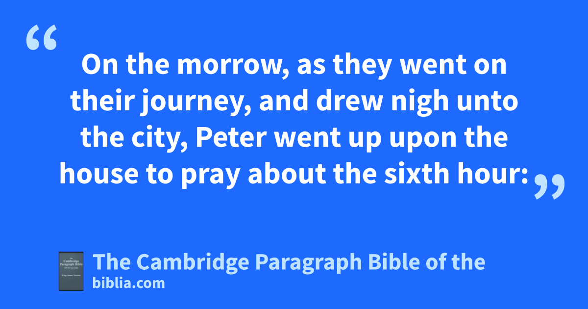 9 On the morrow, as they went on their journey, and drew nigh unto the city, pPeter went up upon qthe house to pray about rthe sixth hour: 10 and he became very hungry, and would have eaten: but while they made ready, he fell into sa trance, 11 and tsaw heaven opened, and a certain vessel descending unto him, as it had been a great sheet knit at the four corners, and let down to the earth: 12 wherein were all manner of fourfooted beasts of the earth, and wild beasts, and creeping things, and fowls of the air. 13 And there came a voice to him, Rise, Peter; kill, and eat. 14 But Peter said, Not so, Lord; for uI have never eaten any thing that is vcommon or wunclean. 15 And the voice spake unto him again the second time, What God hath cleansed, that xcall not thou common. 16 This was done thrice: and the vessel was received up again into heaven.