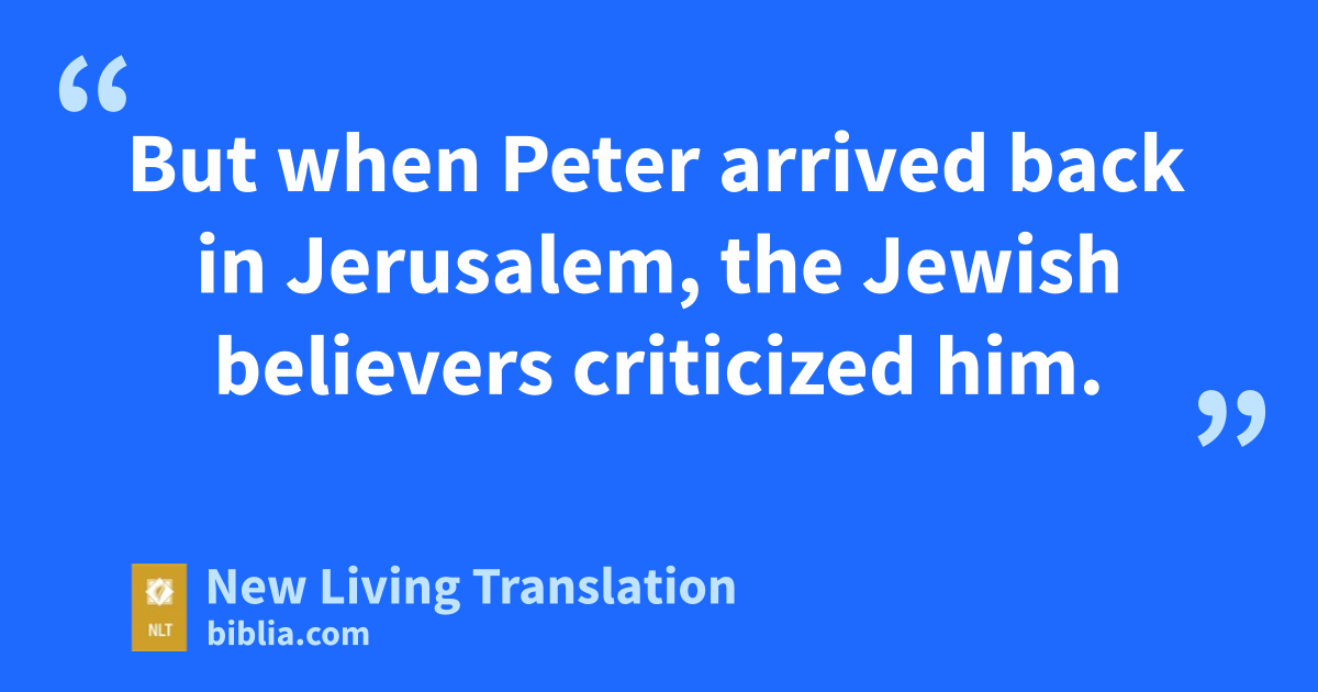 Soon the news reached the apostles and other believers* in Judea that the Gentiles had received the word of God. 2 But when Peter arrived back in Jerusalem, the Jewish believers* criticized him. 3 “You entered the home of Gentiles* and even ate with them!” they said.