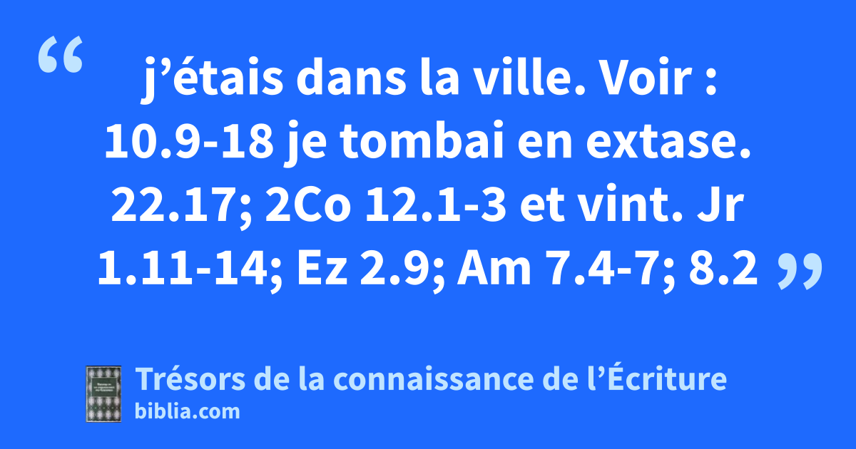 j’étais dans la ville. Voir : 10.9-18 je tombai en extase. 22.17; 2Co 12.1-3 et vint. Jr 1.11-14; Ez 2.9; Am 7.4-7; 8.2
