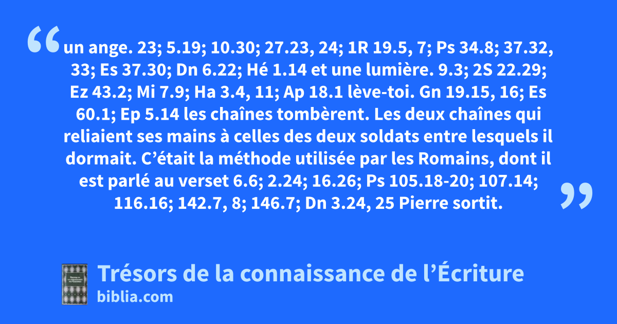 un ange. 23; 5.19; 10.30; 27.23, 24; 1R 19.5, 7; Ps 34.8; 37.32, 33; Es 37.30; Dn 6.22; Hé 1.14 et une lumière. 9.3; 2S 22.29; Ez 43.2; Mi 7.9; Ha 3.4, 11; Ap 18.1 lève-toi. Gn 19.15, 16; Es 60.1; Ep 5.14 les chaînes tombèrent. Les deux chaînes qui reliaient ses mains à celles des deux soldats entre lesquels il dormait. C’était la méthode utilisée par les Romains, dont il est parlé au verset 6.6; 2.24; 16.26; Ps 105.18-20; 107.14; 116.16; 142.7, 8; 146.7; Dn 3.24, 25