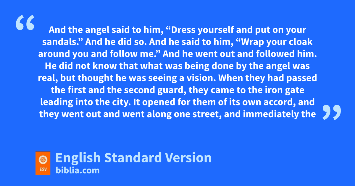 6 Now when Herod was about to bring him out, on that very night, Peter was sleeping between two soldiers, mbound with two chains, and sentries before the door were guarding the prison. 7 And behold, nan angel of the Lord ostood next to him, and a light shone in the cell. pHe struck Peter on the side and woke him, saying, “Get up quickly.” And qthe chains fell off his hands. 8 And the angel said to him, “Dress yourself and rput on your sandals.” And he did so. And he said to him, “Wrap your cloak around you and follow me.” 9 And he went out and followed him. He did not know that what was being done by the angel was real, but sthought he was seeing a vision. 10 When they had passed the first and the second guard, they came to the iron gate leading into the city. tIt opened for them of its own accord, and they went out and went along one street, and immediately the angel left him. 11 When Peter ucame to himself, he said, “Now I am sure that vthe Lord has sent his angel and wrescued me from the hand of Herod and from all that the Jewish people were expecting.”