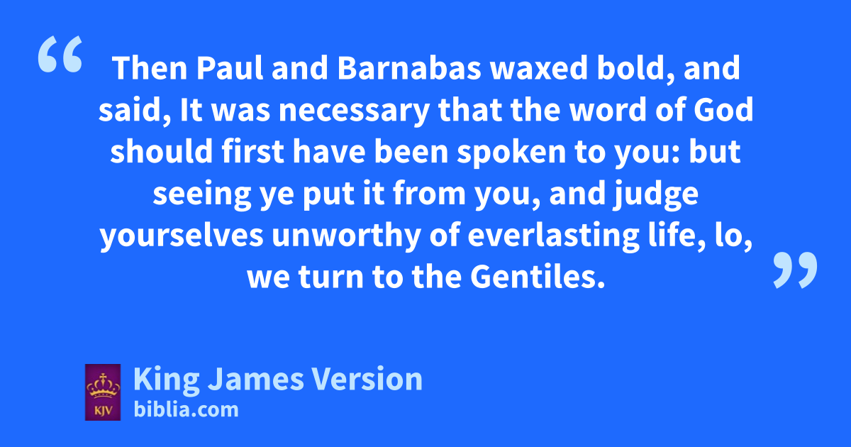 42 And when the Jews were gone out of the synagogue, nthe Gentiles besought that these words might be preached to them †othe next sabbath. 43 Now when the congregation was broken up, many of the Jews and preligious qproselytes followed Paul and Barnabas: who, speaking to them, rpersuaded them to continue in sthe grace of God. 44 And the next sabbath day came almost the whole city together to hear the word of God. 45 But when the Jews saw the multitudes, tthey were filled with envy, and spake against those things which were spoken by Paul, contradicting and ublaspheming. 46 Then Paul and Barnabas xwaxed bold, and said, It was necessary that the word of God should yfirst have been spoken to you: but zseeing ye put it from you, and judge yourselves aunworthy of everlasting life, lo, bwe turn to the Gentiles. 47 For so hath the Lord commanded us, saying, cI have set thee to be a light of the Gentiles, that thou shouldest be for salvation unto the ends of the earth. 48 And when the Gentiles heard this, they were glad, and glorified the word of the Lord: and das many as were ordained to eternal life believed. 49 And the word of the Lord was published throughout all the region. 50 But ethe Jews stirred up the fdevout and ghonourable women, and hthe chief men of the city, and iraised persecution against Paul and Barnabas, and expelled them out of their coasts. 51 But they kshook off the dust of their feet kagainst them, and came unto lIconium. 52 And the disciples were filled with mjoy, and with nthe Holy Ghost.