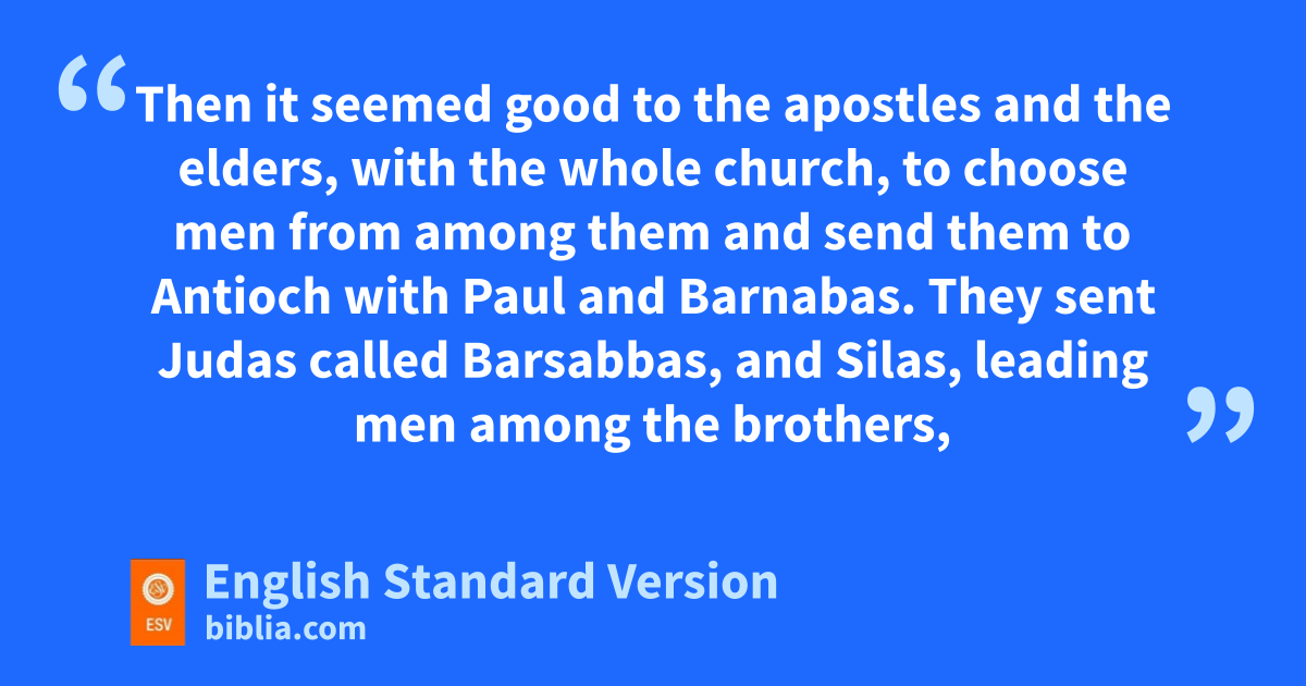 22 Then it seemed good to uthe apostles and the elders, with the whole church, to choose men from among them and send them to Antioch with Paul and Barnabas. They sent Judas called vBarsabbas, and wSilas, leading men among xthe brothers, 23 with the following letter: x“The brothers, both uthe apostles and the elders, to the brothers3 who are of the Gentiles in Antioch and Syria and Cilicia, ygreetings. 24 Since we have heard that zsome persons have gone out from us and atroubled you4 with words, unsettling your minds, although we gave them no instructions, 25 it has seemed good to us, having come bto one accord, to choose men and send them to you with our cbeloved Barnabas and Paul, 26 dmen who have erisked their lives for the name of our Lord Jesus Christ. 27 We have therefore sent fJudas and Silas, who themselves will tell you the same things by word of mouth. 28 For it has seemed good gto the Holy Spirit and hto us ito lay on you no greater burden than these requirements: 29 jthat you abstain from kwhat has been sacrificed to idols, and from blood, and from what has been strangled, and from sexual immorality. If you keep yourselves from these, you will do well. Farewell.”