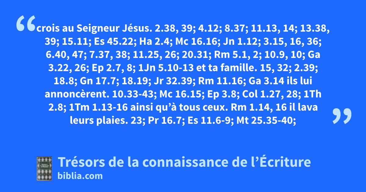 crois au Seigneur Jésus. 2.38, 39; 4.12; 8.37; 11.13, 14; 13.38, 39; 15.11; Es 45.22; Ha 2.4; Mc 16.16; Jn 1.12; 3.15, 16, 36; 6.40, 47; 7.37, 38; 11.25, 26; 20.31; Rm 5.1, 2; 10.9, 10; Ga 3.22, 26; Ep 2.7, 8; 1Jn 5.10-13 et ta famille. 15, 32; 2.39; 18.8; Gn 17.7; 18.19; Jr 32.39; Rm 11.16; Ga 3.14