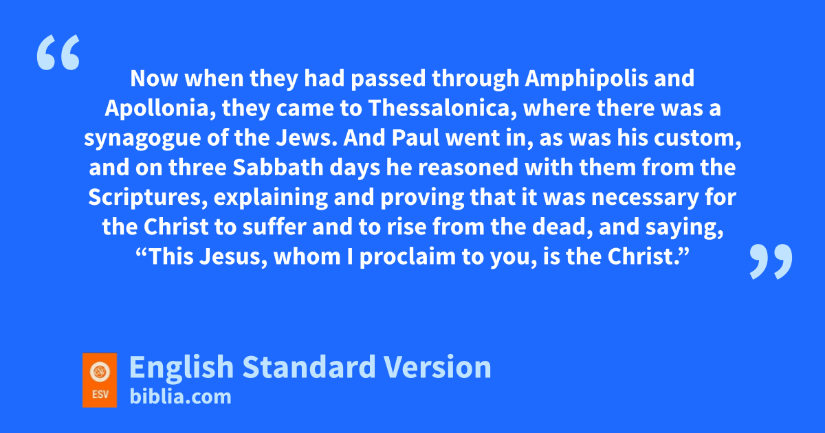 17 Now when they had passed through Amphipolis and Apollonia, they came to gThessalonica, where there was a synagogue of the Jews. 2 And Paul went in, has was his custom, and on three Sabbath days he reasoned with them ifrom the Scriptures, 3 jexplaining and proving that it was necessary for kthe Christ to suffer and lto rise from the dead, and saying, “This Jesus, whom I proclaim to you, is the Christ.” 4 And msome of them were persuaded and joined Paul and Silas, as did na great many of the devout oGreeks and not a few of the leading women. 5 pBut the Jews1 qwere jealous, and taking rsome wicked men of the rabble, they formed a mob, set the city in an uproar, and attacked the house of Jason, seeking to bring them out to the crowd. 6 And when they could not find them, sthey dragged Jason and some of the brothers before the city authorities, shouting, “These men who have turned the world upside down have come here also, 7 and Jason has received them, and they are all acting against tthe decrees of Caesar, saying that there is uanother king, Jesus.” 8 And the people and the city authorities were disturbed when they heard these things. 9 And when they had taken money as security from Jason and the rest, they let them go.