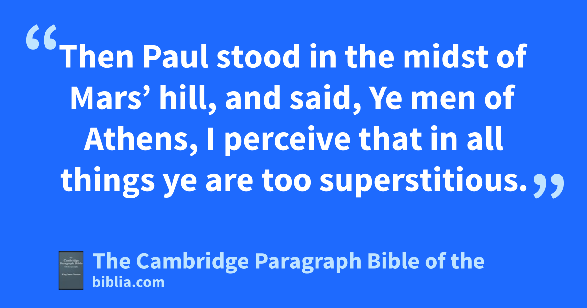 Ye men of Athens, I perceive that in all things ye are too rsuperstitious. 23 For as I passed by, and beheld your * devotions, I found an altar with this sinscription, TO THE UNKNOWN GOD. Whom therefore ye ignorantly worship, thim declare I unto you. 24 uGod that made the world and all things therein, seeing that he is xLord of heaven and earth, ydwelleth not in temples zmade with hands; 25 neither is worshipped with men’s hands, aas though he needed any thing, seeing he giveth to all blife, and breath, and all things; 26 and hath made of one blood all nations of men for to dwell on all the face of the earth, and hath cdetermined the times before appointed, and dthe bounds of their habitation; 27 that they should seek the Lord, if haply they might feel after him, and find him, ethough he be not far from every one of us: 28 for fin him we live, and move, and have our being; as certain also of gyour own poets have said, For we are also his offspring. 29 Forasmuch then as we are the offspring of God, hwe ought not to think that the Godhead is like unto gold, or silver, or stone, graven by art and man’s device. 30 And the times of this ignorance God iwinked at; but know commandeth all men every where to repent: 31 because he hath appointed a day, in the which lhe will judge mthe world in righteousness by that man whom he hath cordained; whereof he * hath given assurance unto all men, in that nhe hath raised him from the dead.