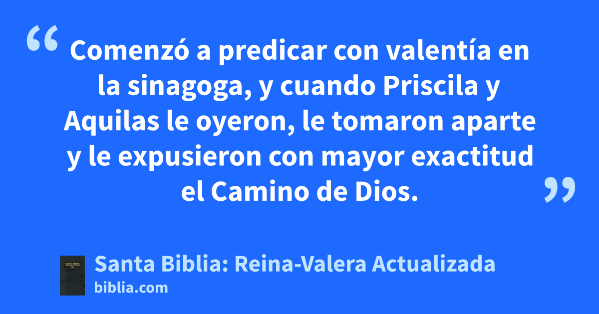 Comenzó a predicar con valentía en la sinagoga, y cuando Priscila y Aquilas le oyeron, le tomaron aparte y le expusieron con mayor exactitud el Camino de Dios.