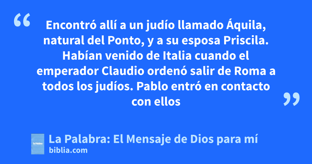 18 A raíz de esto, Pablo partió de Atenas y se dirigió a Corinto. 2 Encontró allí a un judío llamado Áquila, natural del Ponto, y a su esposa Priscila. Habían venido de Italia cuando el emperador Claudio ordenó salir de Roma a todos los judíos. Pablo entró en contacto con ellos 3 y, como era de su mismo oficio, se alojó en su casa, y trabajaron asociados. Su oficio era fabricar tiendas de campaña. 4 Todos los sábados, intervenía Pablo en la sinagoga e intentaba convencer tanto a judíos como a no judíos.