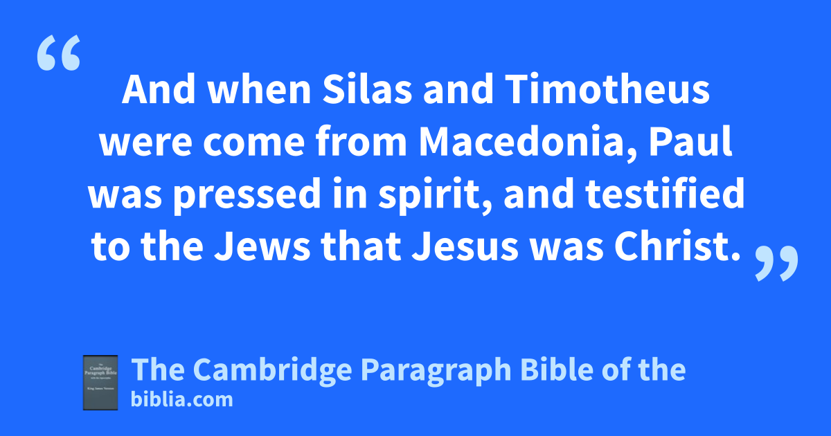 XVIII. After these things Paul departed from Athens, and came to aCorinth; 2 and found a certain Jew named bAquila, born in cPontus, lately come from Italy, with his wife bPriscilla; (because that dClaudius had commanded all Jews to depart from Rome:) and came unto them. 3 And because he was of the same craft, he abode with them, and ewrought: for by their occupation they were tentmakers. 4 And he freasoned gin the synagogue every sabbath, and persuaded the Jews and the Greeks. 5 And hwhen Silas and Timotheus were come from iMacedonia, Paul was jpressed in spirit, and ktestified to the Jews that lJesus * was Christ. 6 And when they opposed themselves, and mblasphemed, nhe shook his raiment, and said unto them, oYour blood be upon your own heads; pI am clean: qfrom henceforth I will go unto the Gentiles. 7 And he departed thence, and entered into a certain man’s house, named Justus, rone that worshipped God, whose house joined hard to the synagogue. 8 And sCrispus, the tchief ruler of the synagogue, believed on the Lord uwith all his house; and many of athe Corinthians hearing believed, and were baptized. 9 Then xspake the Lord to Paul in the night by ya vision, Be not afraid, but speak, and hold not thy peace: 10 for zI am with thee, and no man shall set on thee to hurt thee: for I have much people in this city. 11 And he * continued there a year and six months, teaching the word of God among them.