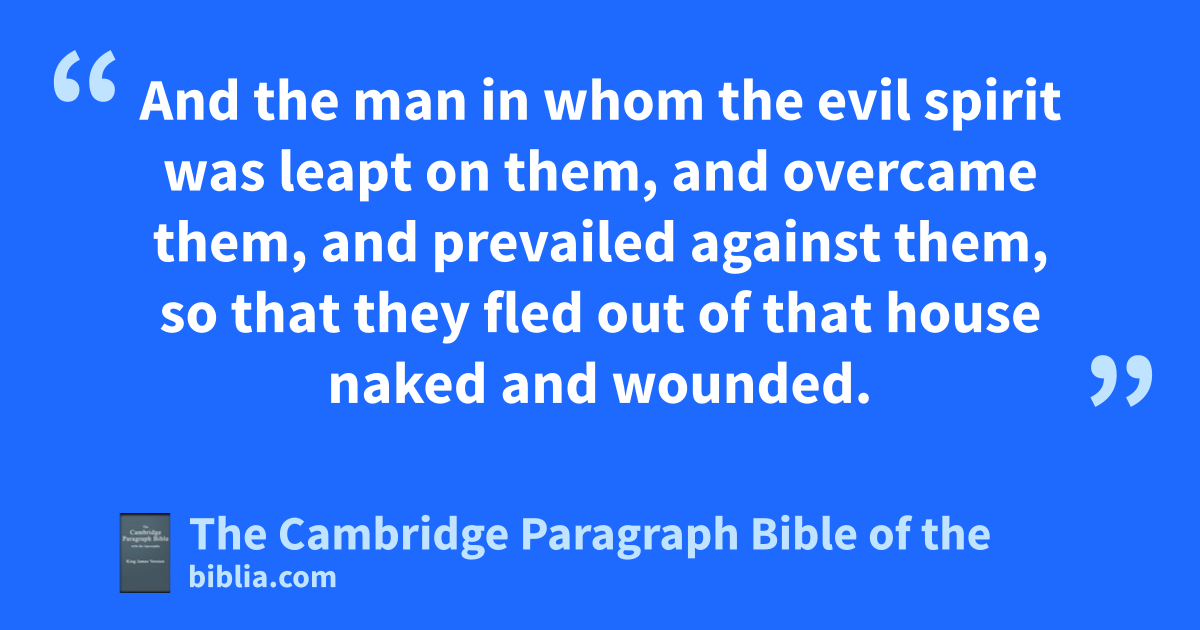 13 * Then certain of the vagabond Jews, aexorcists, btook upon them to call over them which had evil spirits the name of the Lord Jesus, saying, We adjure you by Jesus whom Paul preacheth. 14 And there were seven sons of one Sceva, a Jew, and cchief of the priests, which did so. 15 And the evil spirit answered and said, Jesus I know, and Paul I know; but who are ye? 16 And the man in whom the evil spirit was leapt on them, and overcame them, and prevailed against them, so that they fled out of that house dnaked and wounded. 17 And this was known to all the Jews and Greeks also dwelling at eEphesus; and ffear fell on them all, and the name of the Lord Jesus was magnified. 18 And many that believed came, and gconfessed, and shewed their deeds. 19 Many also of them which used curious arts brought their books together, and burned them before all men: and they counted the price of them, and found it fifty thousand hpieces of silver. 20 So mightily igrew the word of God and prevailed.