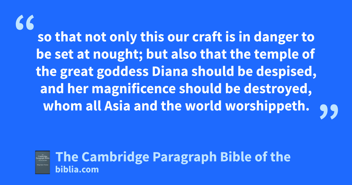 21 * After these things were ended, Paul kpurposed in the spirit, lwhen he had passed through mnMacedonia and moAchaia, pto go to Jerusalem, saying, After I have been there, qI must also see Rome. 22 So he sent into nMacedonia two of rthem that ministered unto him, sTimotheus and tErastus; but he himself stayed in uAsia for a season. 23 And the same time there arose wno small stir about xthat way. 24 For a certain man named Demetrius, a silversmith, which made silver shrines for Diana, brought yno small gain unto the craftsmen; 25 whom he called together with the workmen of like occupation, and said, Sirs, ye know that by this craft we have our wealth. 26 Moreover ye see and hear, that not alone at eEphesus, but almost throughout all uAsia, this Paul hath persuaded and turned away much people, saying that zthey be no gods, which are made with hands: 27 so that not only this our craft is in danger to be set at nought; but also that the temple of the great goddess Diana ashould be despised, and her magnificence should be destroyed, whom all hAsia and bthe world worshippeth. 28 And when they heard these sayings, they were full of wrath, and cried out, saying, Great is Diana of the Ephesians. 29 And the whole city was filled with iconfusion: and having ccaught dGaius and eAristarchus, men of Macedonia, Paul’s fcompanions in travel, they rushed with one accord into the theatre. 30 And when Paul would have entered in unto the people, the gdisciples suffered him not. 31 And certain of the chief of hAsia, which were his friends, sent unto him, desiring him that he would not adventure himself into the theatre. 32 Some therefore cried one thing, and some another: for the assembly was iconfused; and the more part knew not wherefore they were come together. 33 And they kdrew Alexander out of the multitude, the Jews putting him forward. And lAlexander mbeckoned with the hand, and would have nmade his defence unto the people. 34 But when they knew that he was a Jew, all with one voice about the space of two hours cried out, Great is Diana of the Ephesians. 35 And when the townclerk had oappeased the people, he said, Ye men of Ephesus, what man is there that knoweth not how that the city of the Ephesians is * a worshipper of the great goddess Diana, and of the image which fell down from Jupiter? 36 Seeing then that these things cannot be spoken against, ye ought to be oquiet, and to do nothing prashly. 37 For ye have brought hither these men, which are neither qrobbers of churches, nor yet blasphemers of your goddess. 38 Wherefore if Demetrius, and the craftsmen which are with him, have a matter against any man, * the law is open, and there are rdeputies: let them simplead one another. 39 But if ye inquire any thing concerning other matters, it shall be determined in a * lawful assembly. 40 For we are in danger to be scalled in question for this day’s uproar, there being no cause whereby we may give an account of this concourse. 41 And when he had thus spoken, he dismissed the assembly.