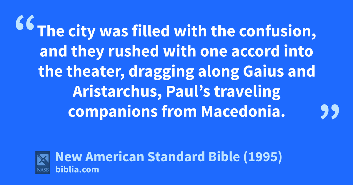 29 The city was filled with the confusion, and they rushed 1with one accord into the theater, dragging along aGaius and bAristarchus, Paul’s traveling ccompanions from dMacedonia.