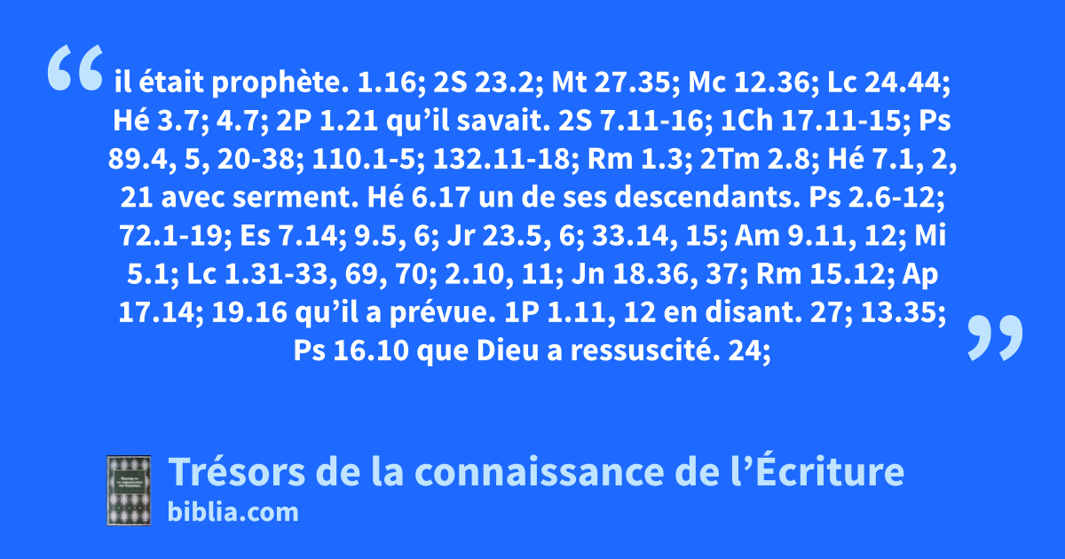 il était prophète. 1.16; 2S 23.2; Mt 27.35; Mc 12.36; Lc 24.44; Hé 3.7; 4.7; 2P 1.21 qu’il savait. 2S 7.11-16; 1Ch 17.11-15; Ps 89.4, 5, 20-38; 110.1-5; 132.11-18; Rm 1.3; 2Tm 2.8; Hé 7.1, 2, 21 avec serment. Hé 6.17 un de ses descendants. Ps 2.6-12; 72.1-19; Es 7.14; 9.5, 6; Jr 23.5, 6; 33.14, 15; Am 9.11, 12; Mi 5.1; Lc 1.31-33, 69, 70; 2.10, 11; Jn 18.36, 37; Rm 15.12; Ap 17.14; 19.16