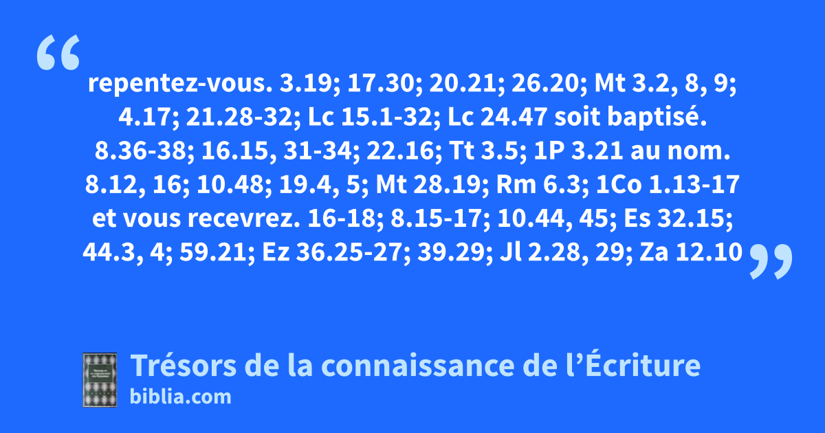 repentez-vous. 3.19; 17.30; 20.21; 26.20; Mt 3.2, 8, 9; 4.17; 21.28-32; Lc 15.1-32; Lc 24.47 soit baptisé. 8.36-38; 16.15, 31-34; 22.16; Tt 3.5; 1P 3.21 au nom. 8.12, 16; 10.48; 19.4, 5; Mt 28.19; Rm 6.3; 1Co 1.13-17 et vous recevrez. 16-18; 8.15-17; 10.44, 45; Es 32.15; 44.3, 4; 59.21; Ez 36.25-27; 39.29; Jl 2.28, 29; Za 12.10