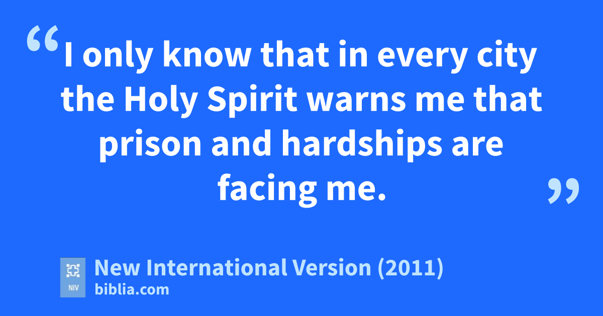 22 “And now, compelled by the Spirit, I am going to Jerusalem,k not knowing what will happen to me there. 23 I only know that in every city the Holy Spirit warns mel that prison and hardships are facing me.m 24 However, I consider my life worth nothing to me;n my only aim is to finish the raceo and complete the taskp the Lord Jesus has given meq—the task of testifying to the good news of God’s grace.r