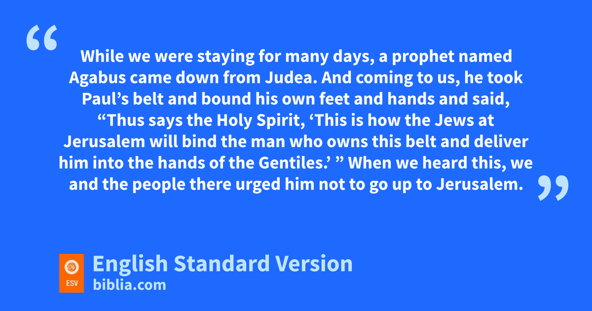 7 When we had finished the voyage from Tyre, we arrived at Ptolemais, and we greeted xthe brothers2 and stayed with them for one day. 8 On the next day we departed and came to Caesarea, and we entered the house of yPhilip zthe evangelist, who was one of the seven, and stayed with him. 9 He had four unmarried daughters, awho prophesied. 10 While we were staying for many days, a prophet named bAgabus came down from Judea. 11 And coming to us, he ctook Paul’s belt and bound his own feet and hands and said, d“Thus says the Holy Spirit, e‘This is how the Jews3 at Jerusalem will bind the man who owns this belt and fdeliver him into the hands of the Gentiles.’ ” 12 When we heard this, we and the people there gurged him not to go up to Jerusalem. 13 Then Paul answered, g“What are you doing, weeping and breaking my heart? For hI am ready not only to be imprisoned but even to die in Jerusalem ifor the name of the Lord Jesus.” 14 And since he would not be persuaded, jwe ceased and said, k“Let the will of the Lord be done.”