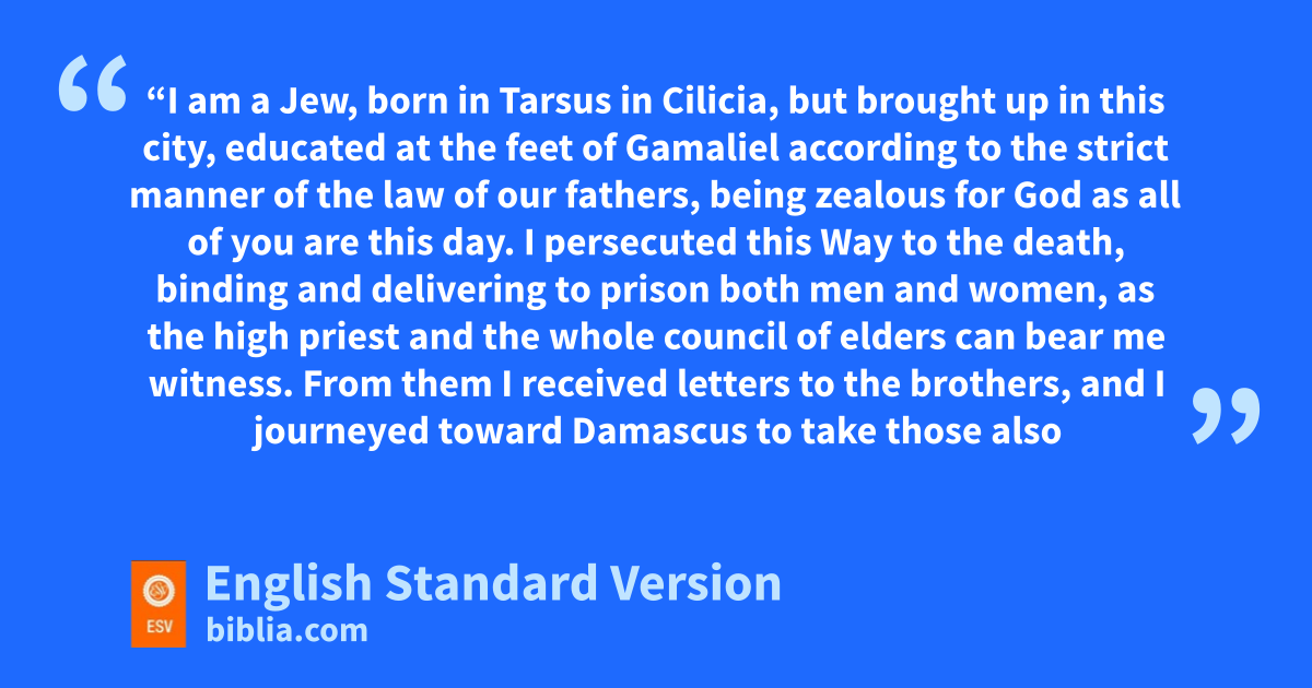 3 y“I am a Jew, born in Tarsus in Cilicia, but brought up in this city, educated zat the feet of aGamaliel2 baccording to the strict manner of the law of our fathers, cbeing zealous for God das all of you are this day. 4 eI persecuted fthis Way gto the death, binding and delivering to prison both men and women, 5 as hthe high priest and ithe whole council of elders can bear me witness. From them I received letters to jthe brothers, and I journeyed toward Damascus to take those also who were there and bring them in bonds to Jerusalem to be punished.