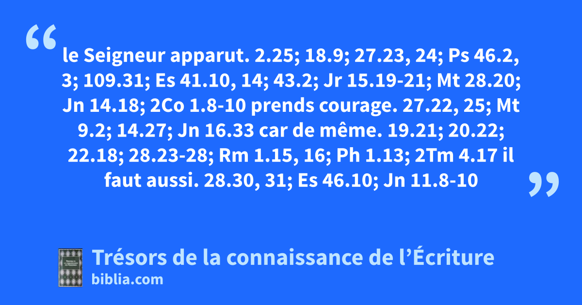 le Seigneur apparut. 2.25; 18.9; 27.23, 24; Ps 46.2, 3; 109.31; Es 41.10, 14; 43.2; Jr 15.19-21; Mt 28.20; Jn 14.18; 2Co 1.8-10 prends courage. 27.22, 25; Mt 9.2; 14.27; Jn 16.33 car de même. 19.21; 20.22; 22.18; 28.23-28; Rm 1.15, 16; Ph 1.13; 2Tm 4.17 il faut aussi. 28.30, 31; Es 46.10; Jn 11.8-10