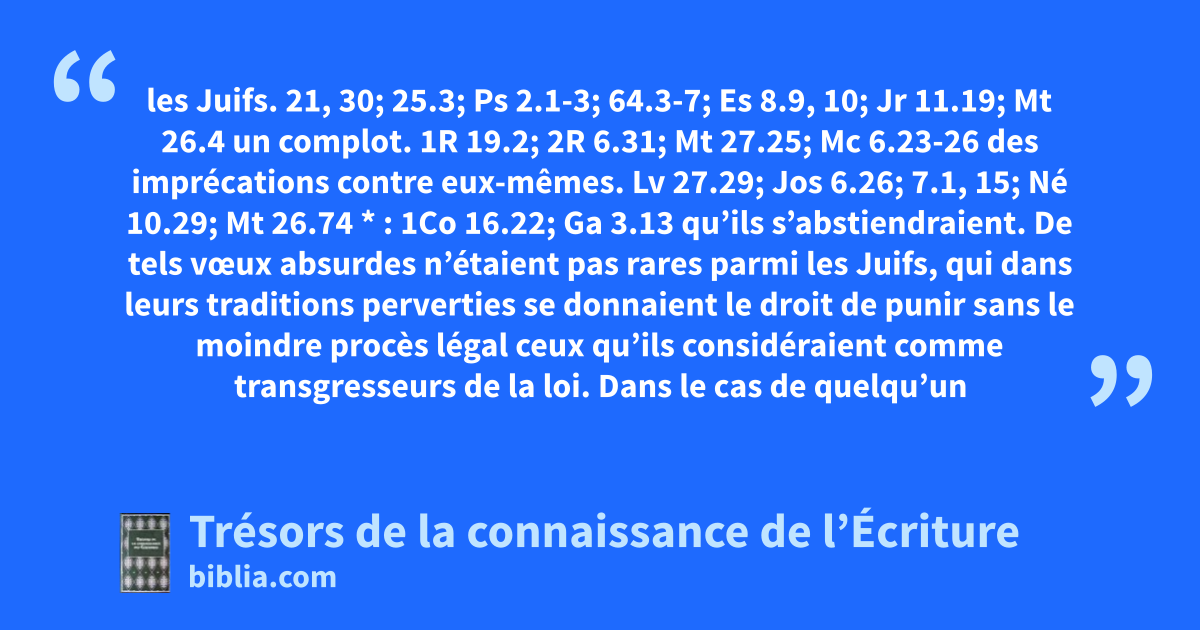 les Juifs. 21, 30; 25.3; Ps 2.1-3; 64.3-7; Es 8.9, 10; Jr 11.19; Mt 26.4 un complot. 1R 19.2; 2R 6.31; Mt 27.25; Mc 6.23-26 des imprécations contre eux-mêmes. Lv 27.29; Jos 6.26; 7.1, 15; Né 10.29; Mt 26.74 * : 1Co 16.22; Ga 3.13 qu’ils s’abstiendraient. De tels vœux absurdes n’étaient pas rares parmi les Juifs, qui dans leurs traditions perverties se donnaient le droit de punir sans le moindre procès légal ceux qu’ils considéraient comme transgresseurs de la loi. Dans le cas de quelqu’un qui avait abandonné la loi de Moïse, les « justiciers » pensaient être justifiés en le tuant. Ils n’ont donc aucun scrupule à associer les principaux sacrificateurs et les anciens à leur conspiration envers la vie de Paul, étant certainement pour la plupart de la secte des Sadducéens, les pires ennemis de l’apôtre. Les sacrificateurs ne blâmaient pas cette conduite puisque un peu plus tard ils envisagent un attentat similaire. Ac 25.2, 3. Par contre il n’ont pas eu à mourir de faim lorsque la providence divine les a empêchés d’accomplir leur vœu, car ce vœu d’abstinence pouvait être rompu par n’importe lequel de leurs Rabbins, qui avaient le pouvoir de les absoudre. 1S 14.24, 27, 28, 40-44; Ps 31.14