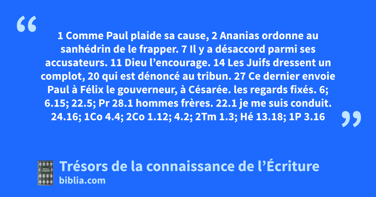 1 Comme Paul plaide sa cause, 2 Ananias ordonne au sanhédrin de le frapper. 7 Il y a désaccord parmi ses accusateurs. 11 Dieu l’encourage. 14 Les Juifs dressent un complot, 20 qui est dénoncé au tribun. 27 Ce dernier envoie Paul à Félix le gouverneur, à Césarée.