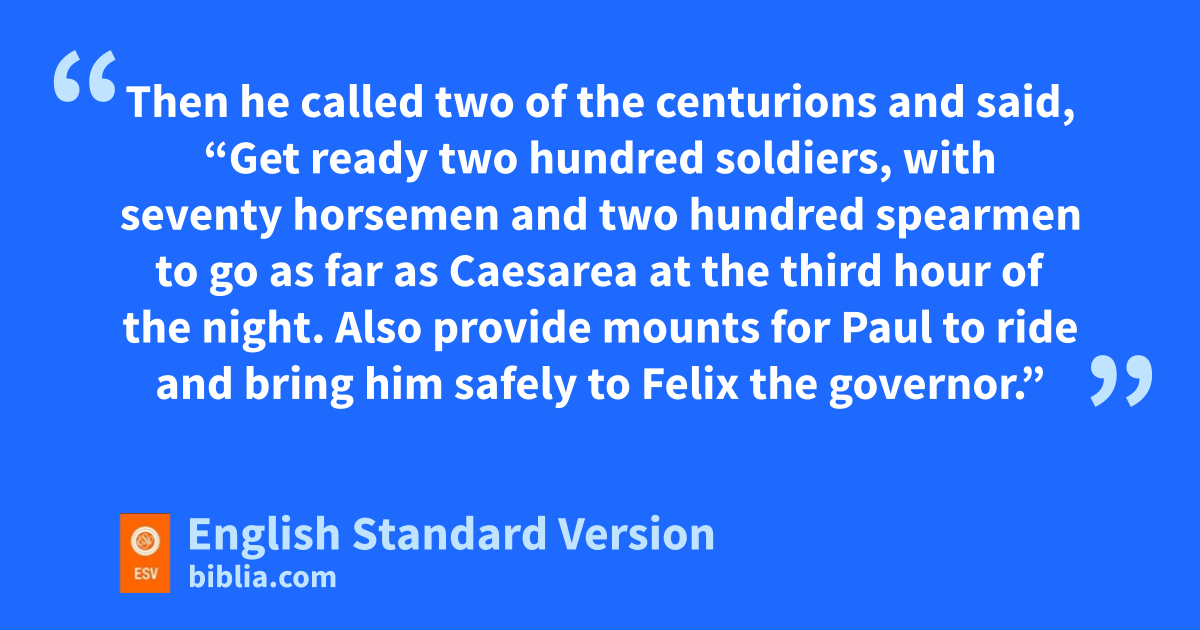 23 Then he called two of the centurions and said, “Get ready two hundred soldiers, with seventy horsemen and two hundred spearmen to go as far as Caesarea at the third hour of the night.1 24 Also provide mounts for Paul to ride and bring him safely to aFelix bthe governor.” 25 And he wrote a letter to this effect: